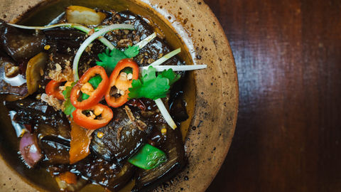 braised aubergine in spicy caramel sauce with straw mushrooms, and served in a clay pot